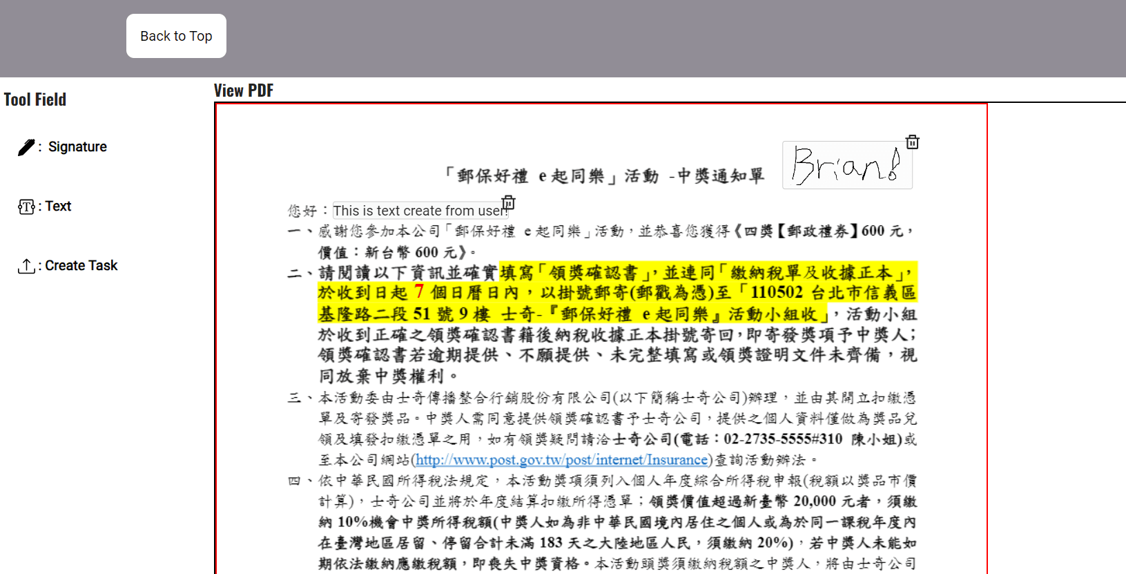 This is a PDF Editor with the Next front-end, Node back-end, and MongoDB database. The user can upload their pdf file and add block to writing their signature and typing the text. After that, they can download the modified version pdf file!