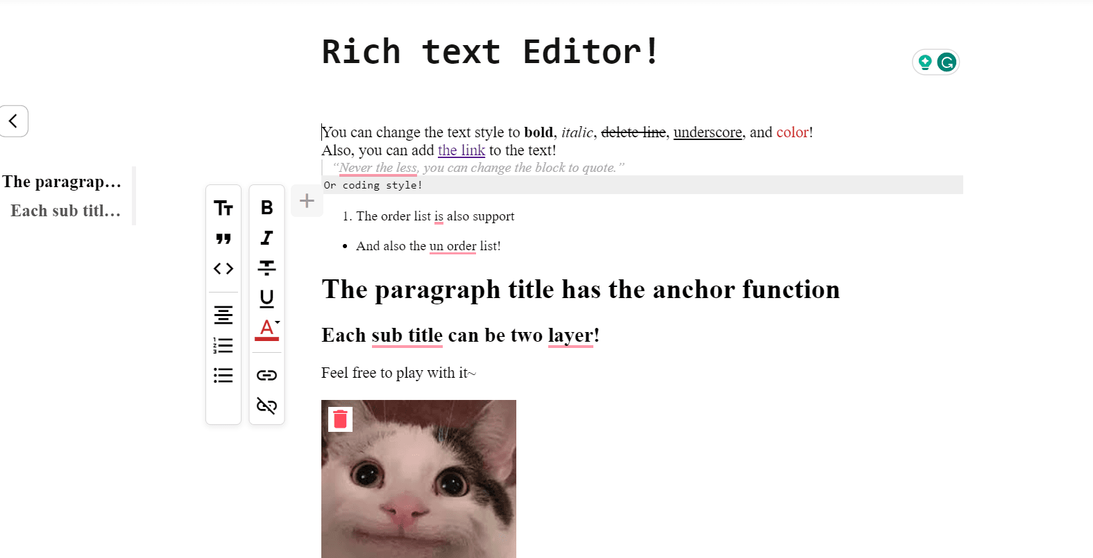 This is a rich text editor create with SlateJs library. The user can write the text in bold, italic, ...etc and add online picture, link, and code block. After that, you can output the html into serialized string format!